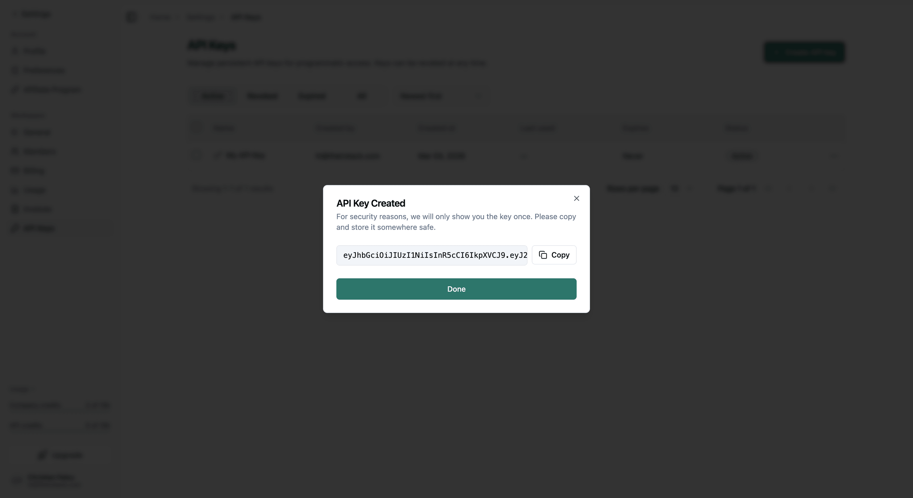 Copy your API key and store it somewhere safe. For security reasons, the key is only shown once.