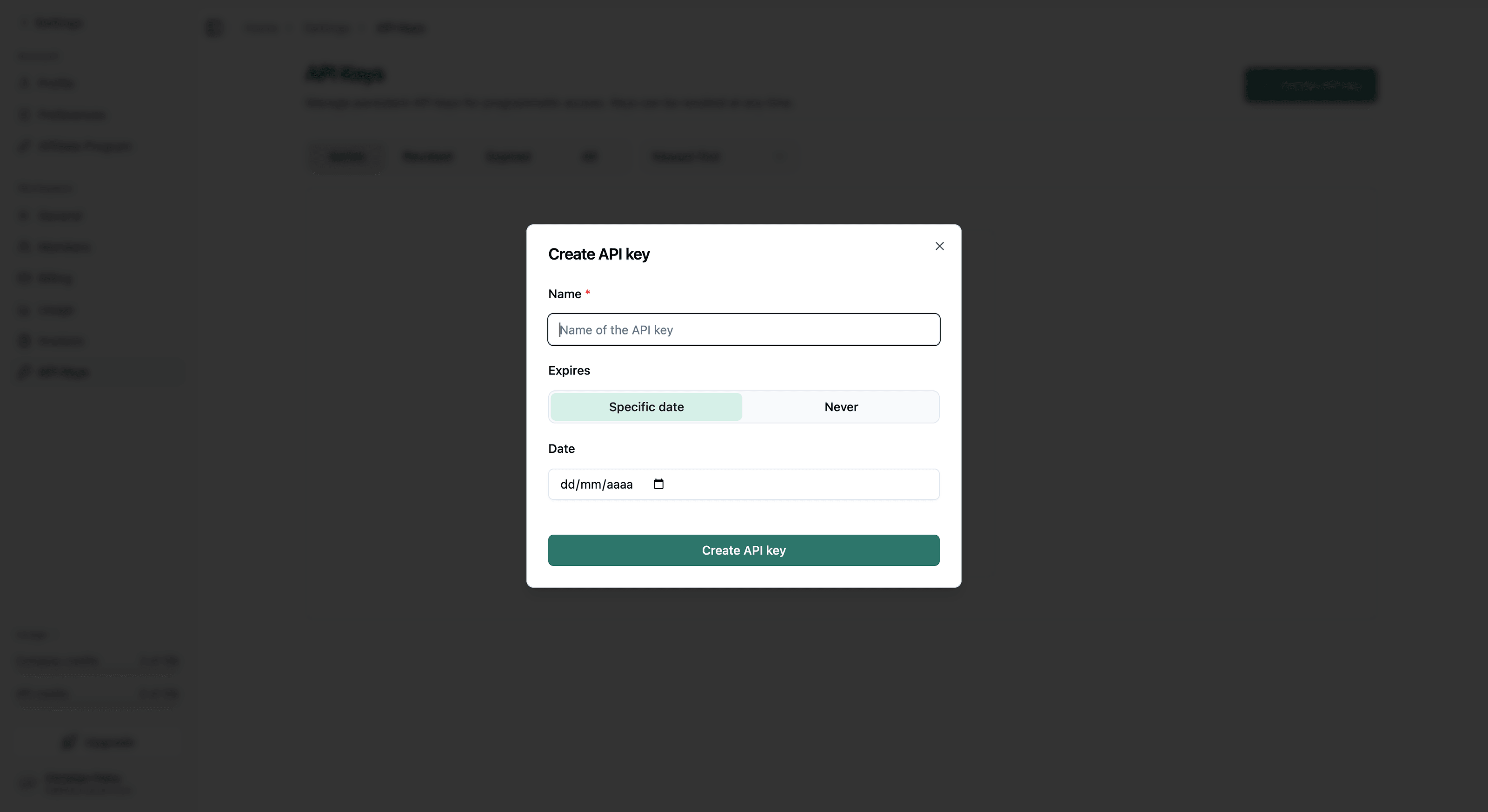 Give your key a name and choose an expiration policy — either a specific date or Never.