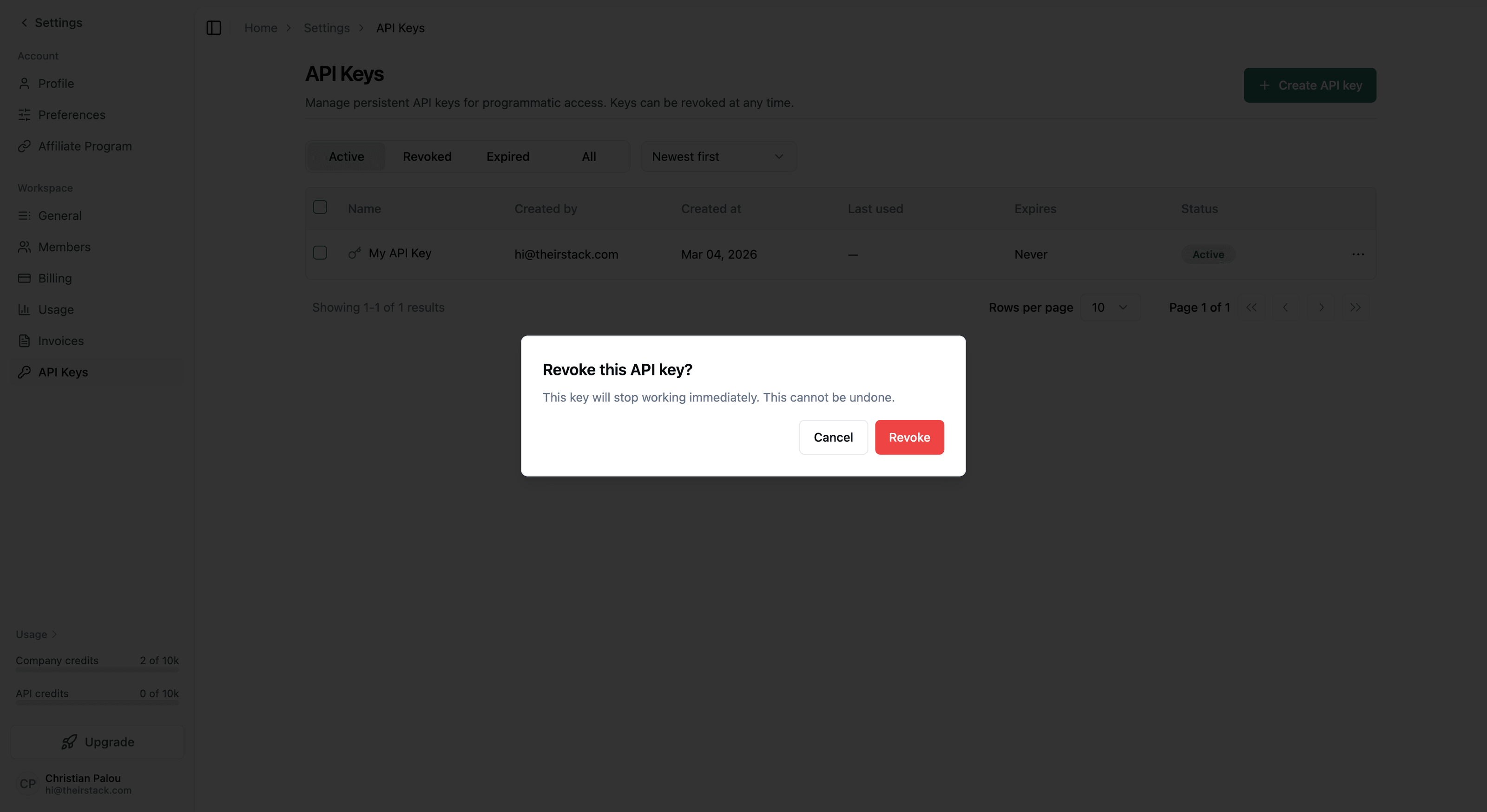 Confirm the revocation. The key will stop working immediately and this action cannot be undone.