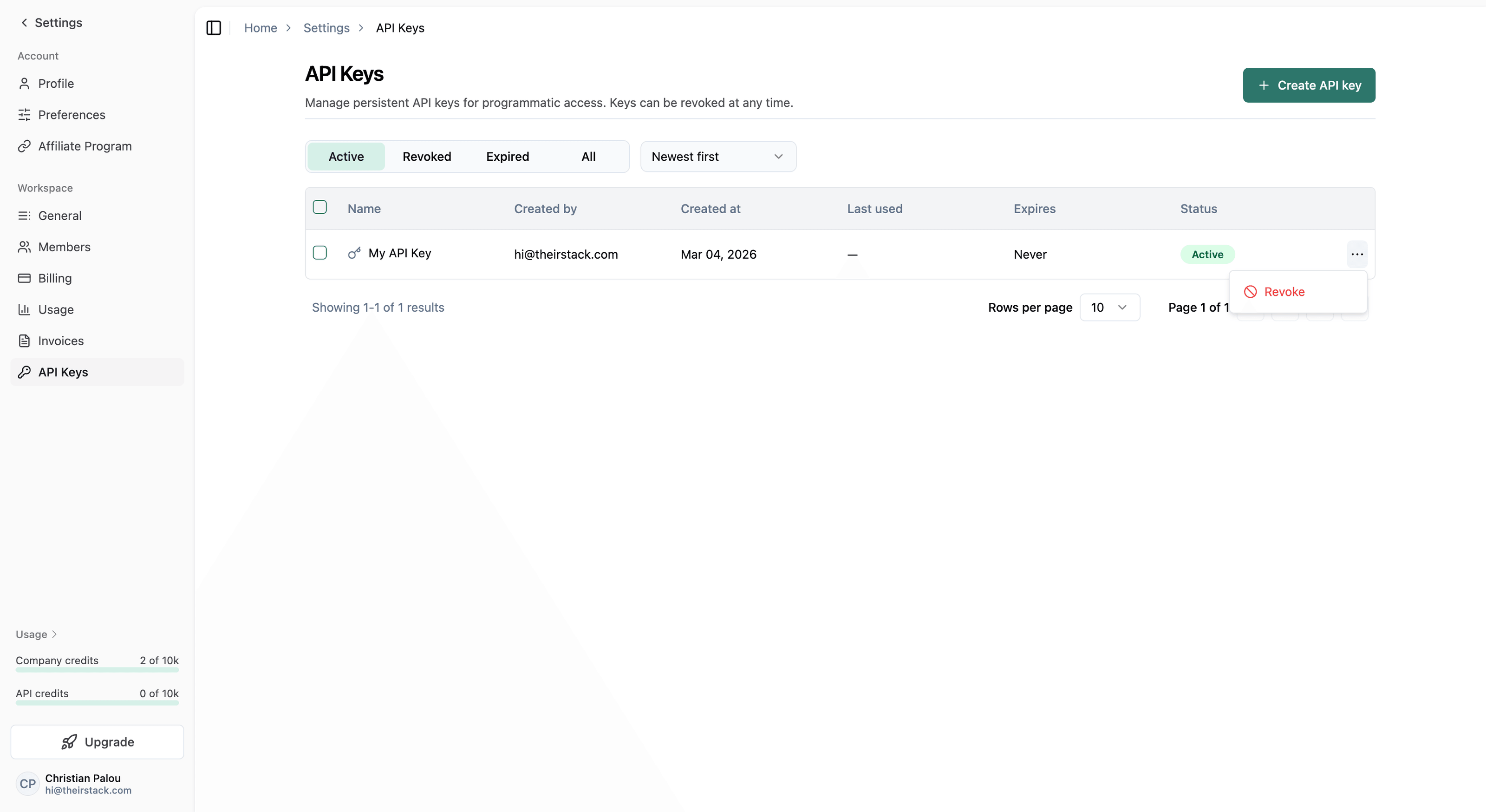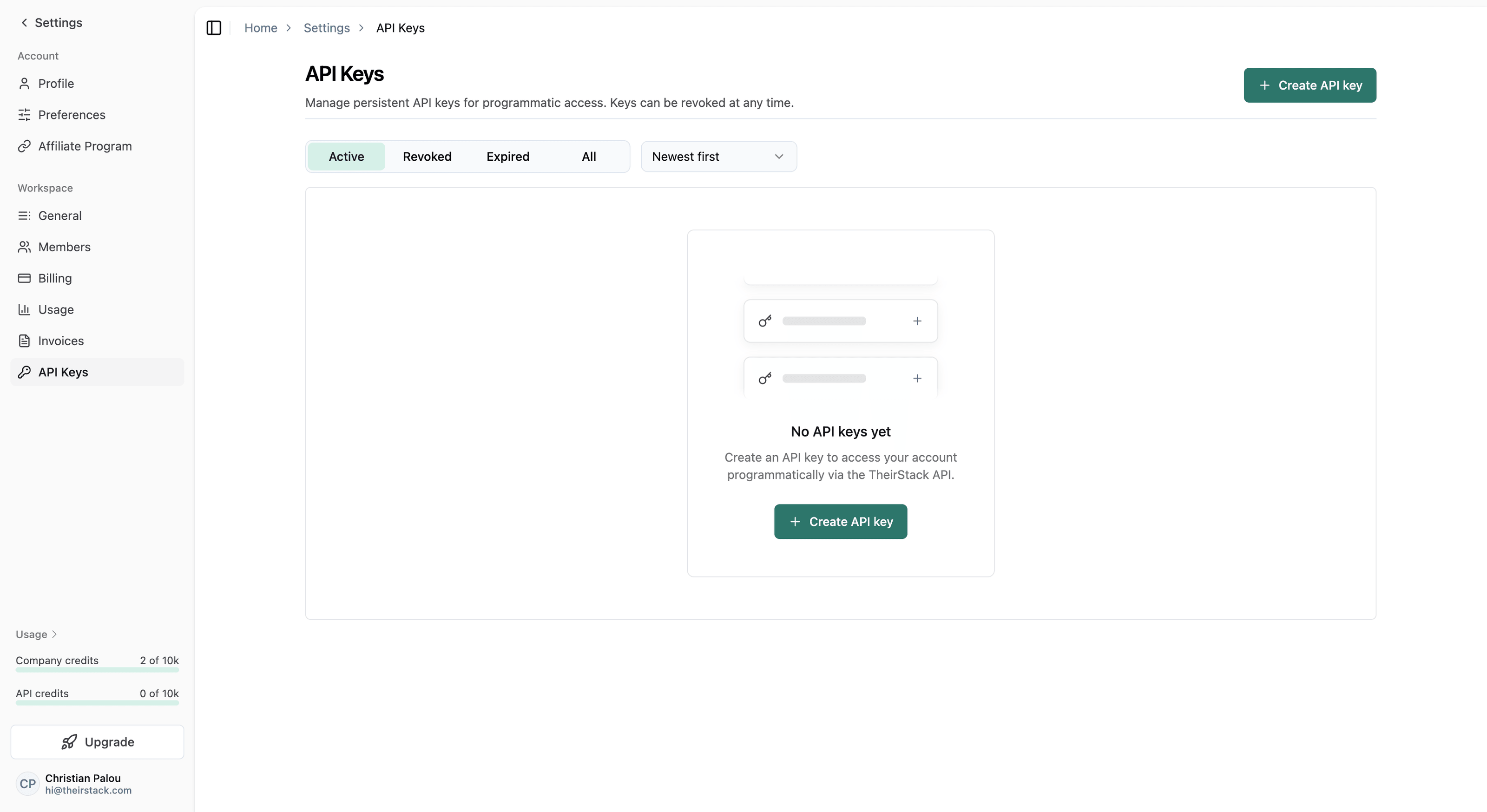 Learn how to set up TheirStack API authentication with Bearer token API keys — create, manage, and revoke keys directly from your account settings.