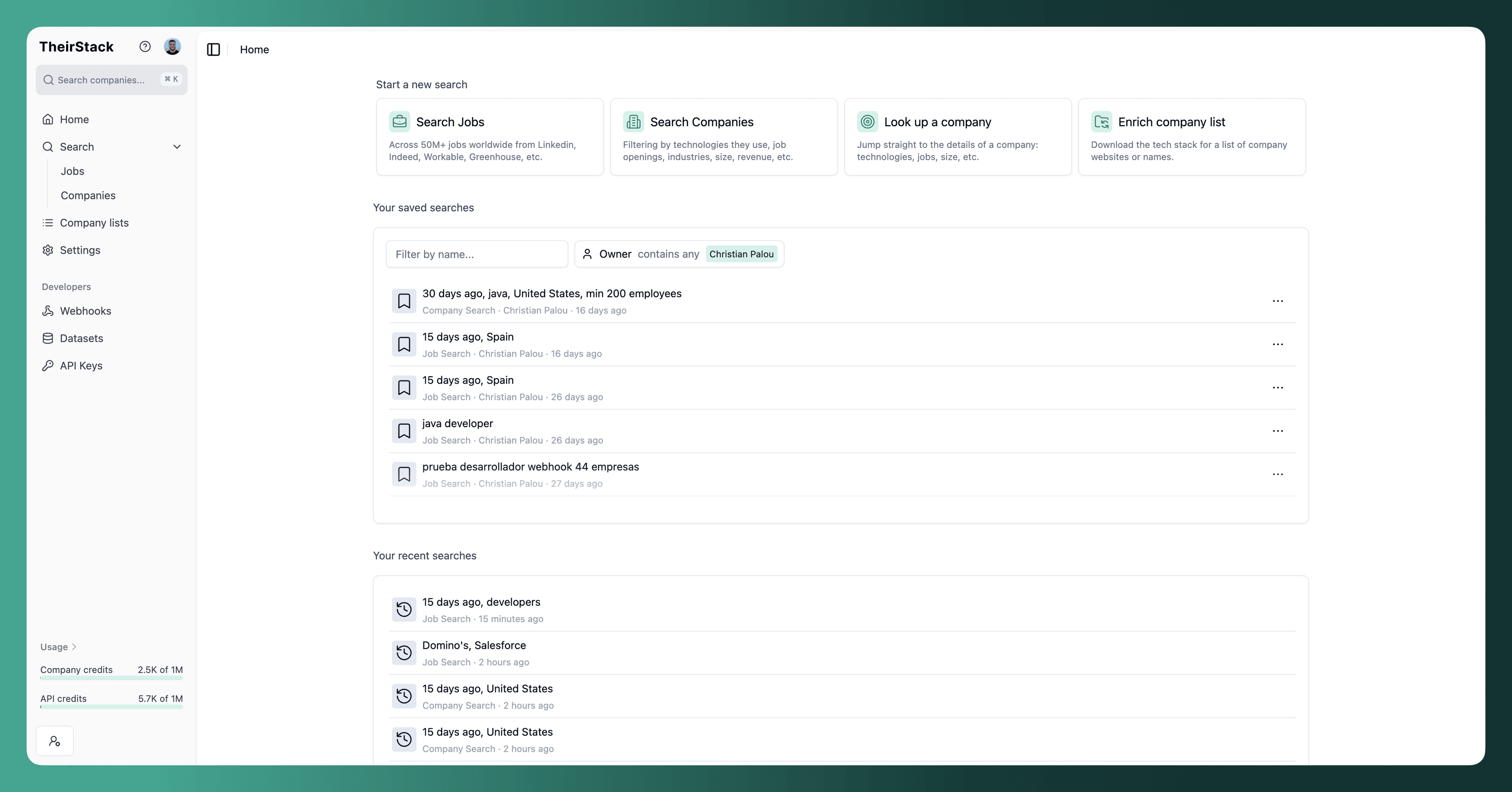 TheirStack App offers easy access to all features, including exporting company lists based on technology usage, searching for jobs across multiple job boards simultaneously, performing detailed company lookups, and more.