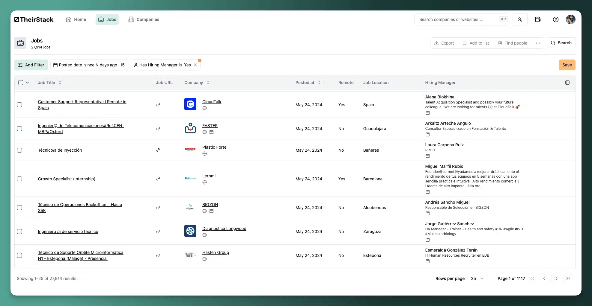 To do this, set the filter Has hiring manager -> Yes in the Job Search view on app.theirstack.com