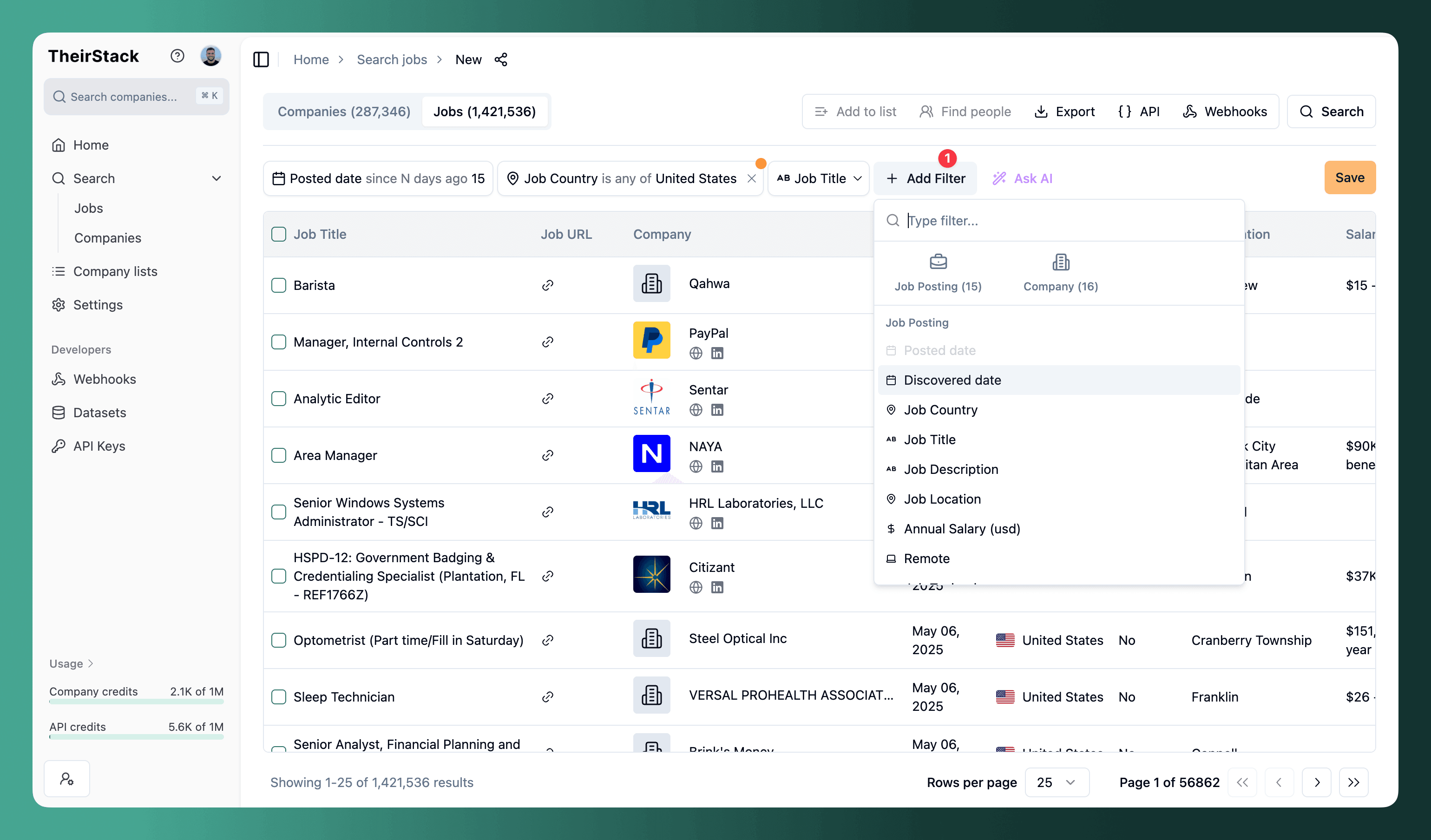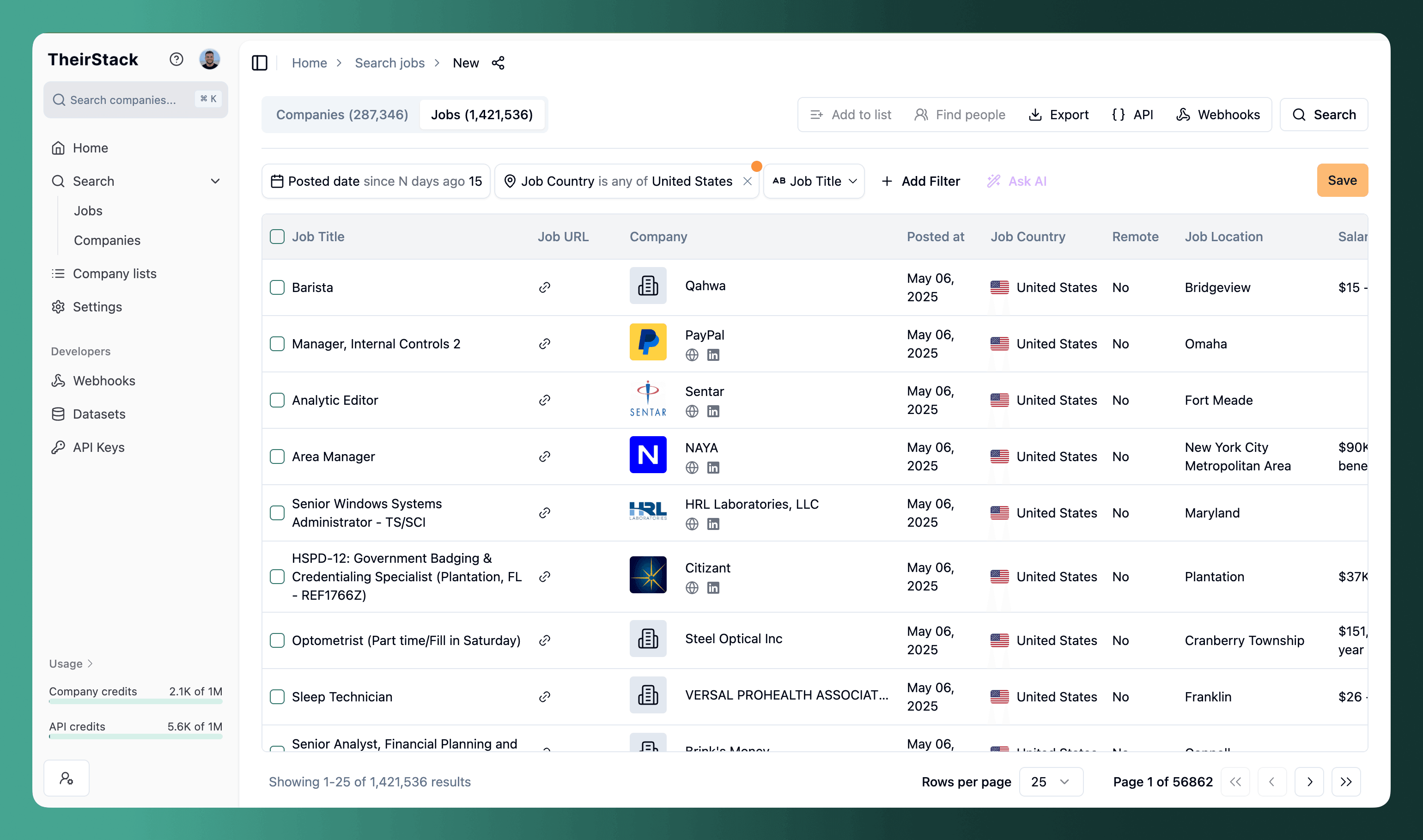 TheirStack is a sales tool designed to discover purchase intent signals through job postings. It helps SaaS companies, recruiting agencies, and consulting firms find their next customer by analyzing 40+ million job listings across 100+ countries.