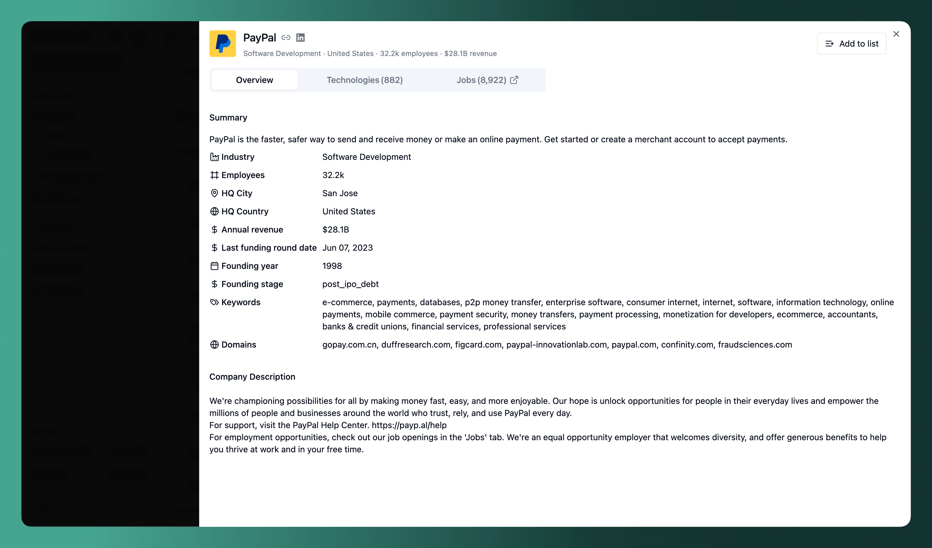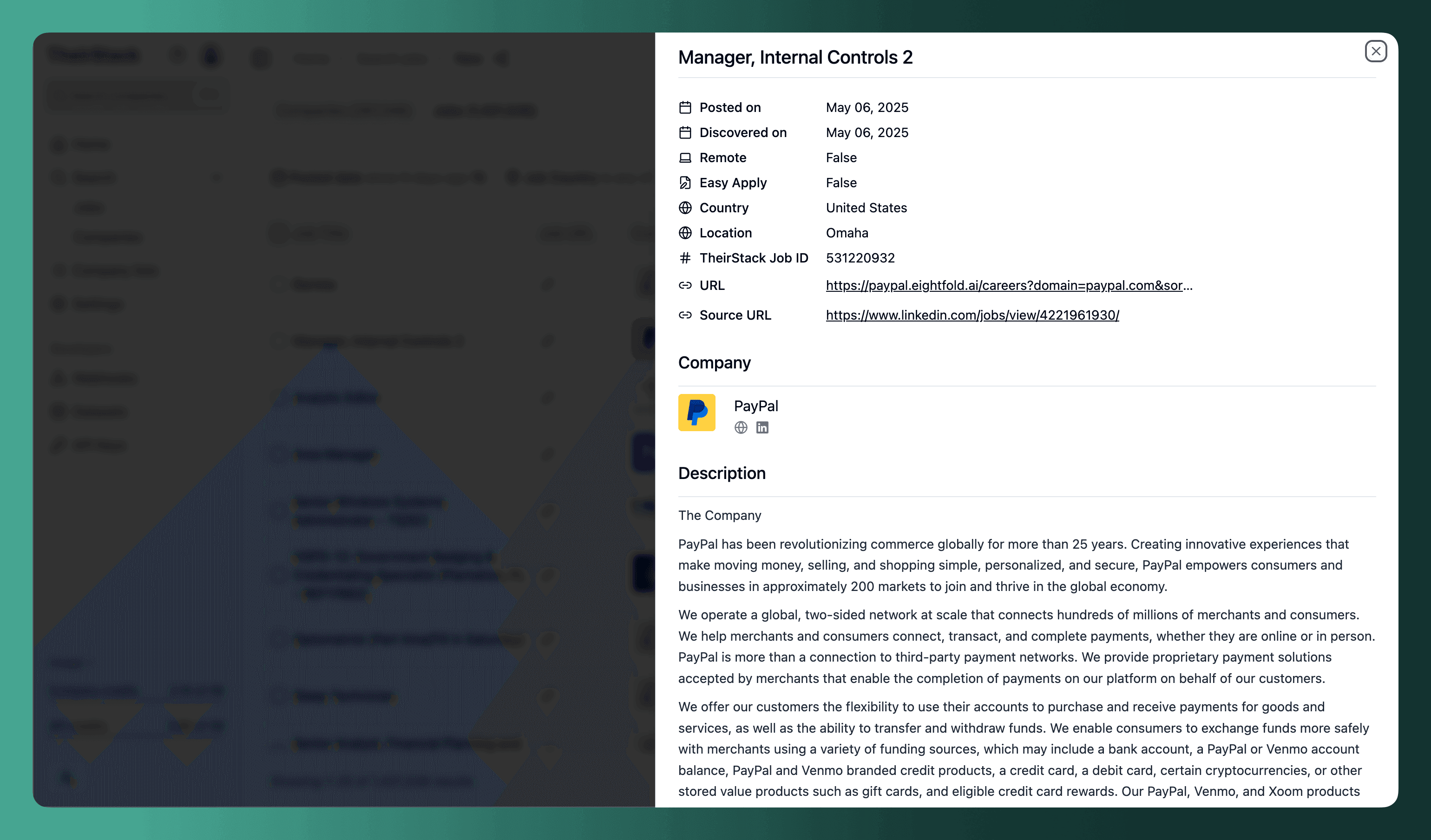 Similarly to how you see the details about a job, when you click on a company name a new modal will open displaying as much information we have about a company. In it, you can see data like their headcount, revenue per year, funding data and more in the Overview tab.