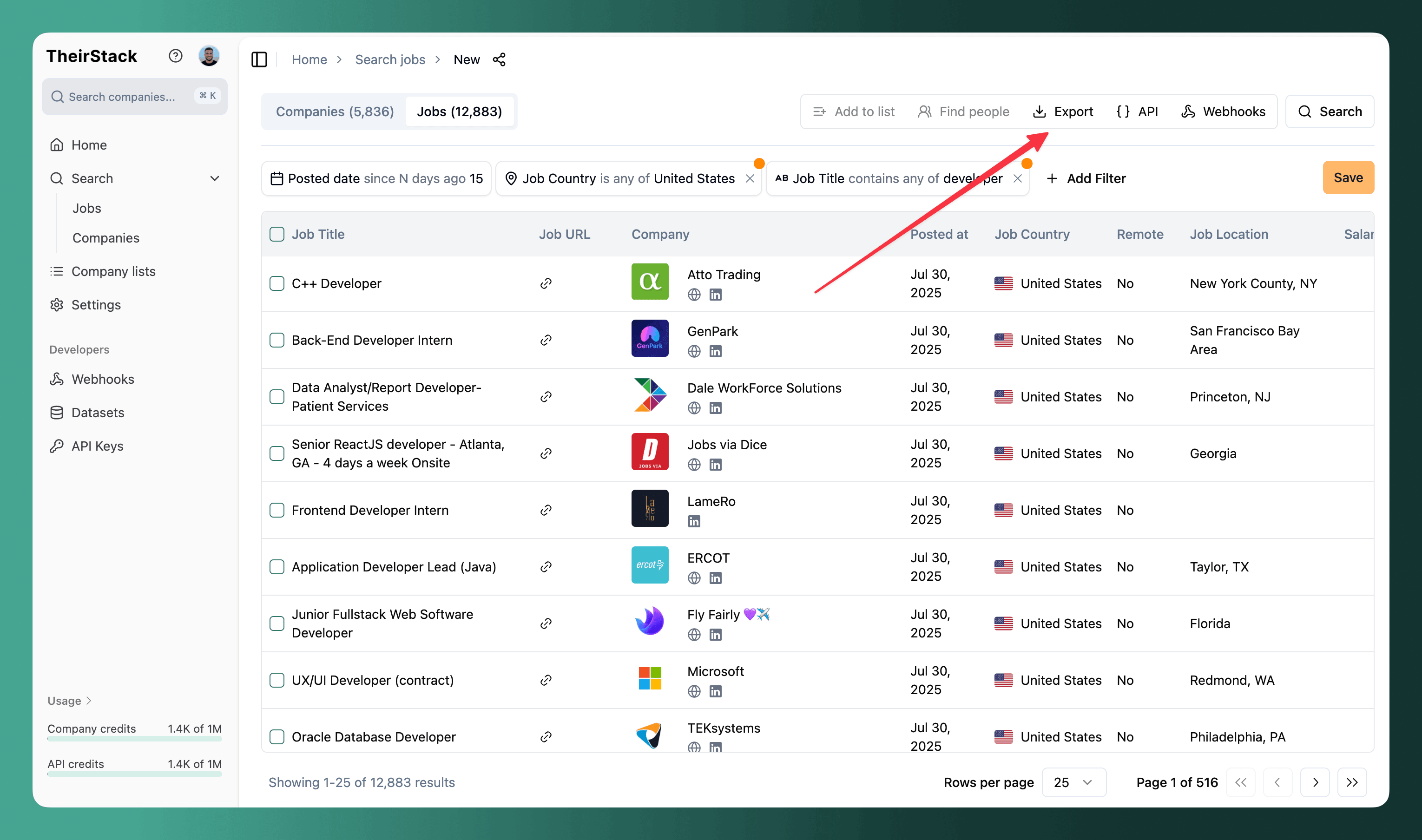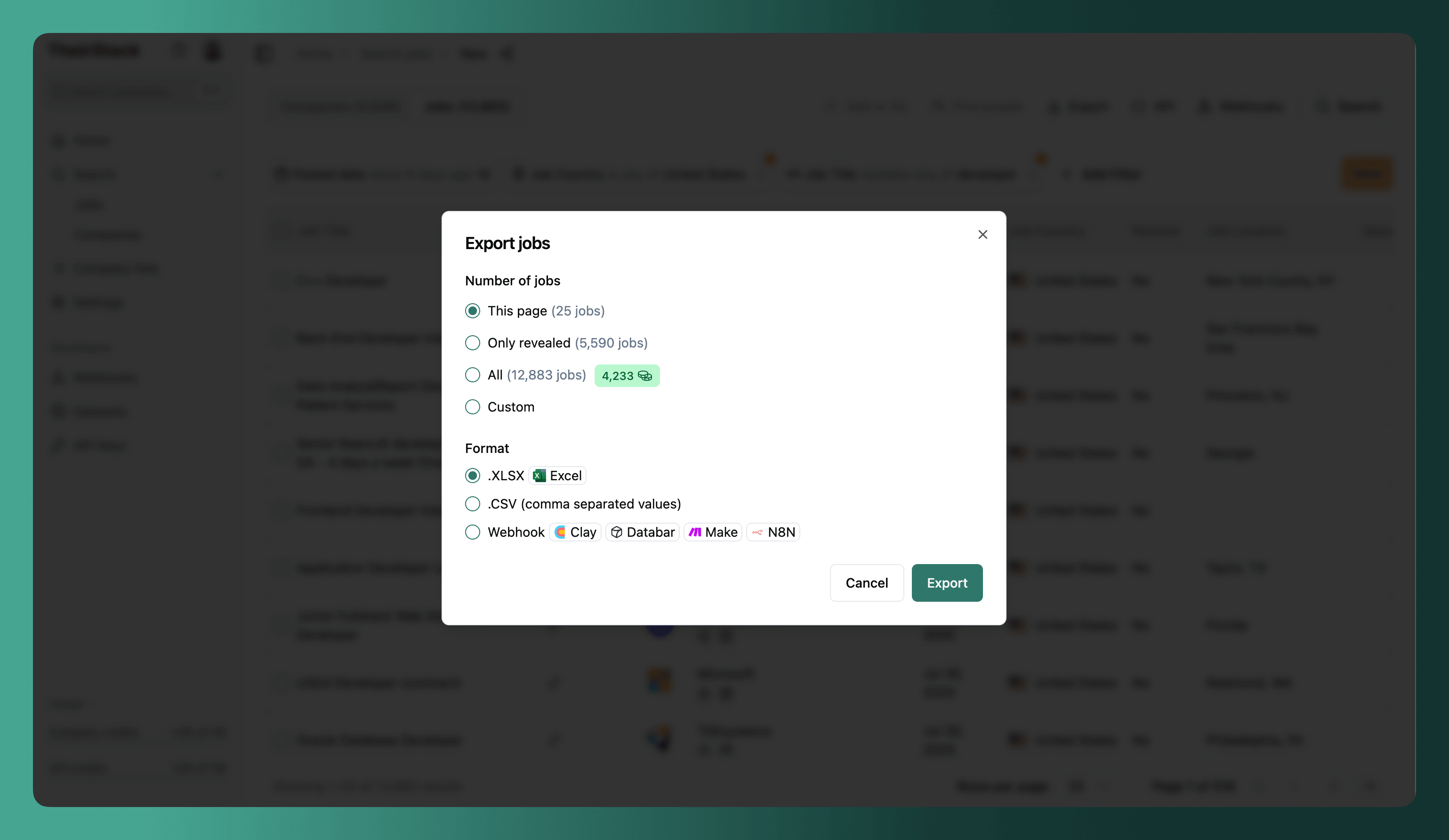 - You can export only the current page, only jobs from revealed companies, all jobs or a custom number of jobs.