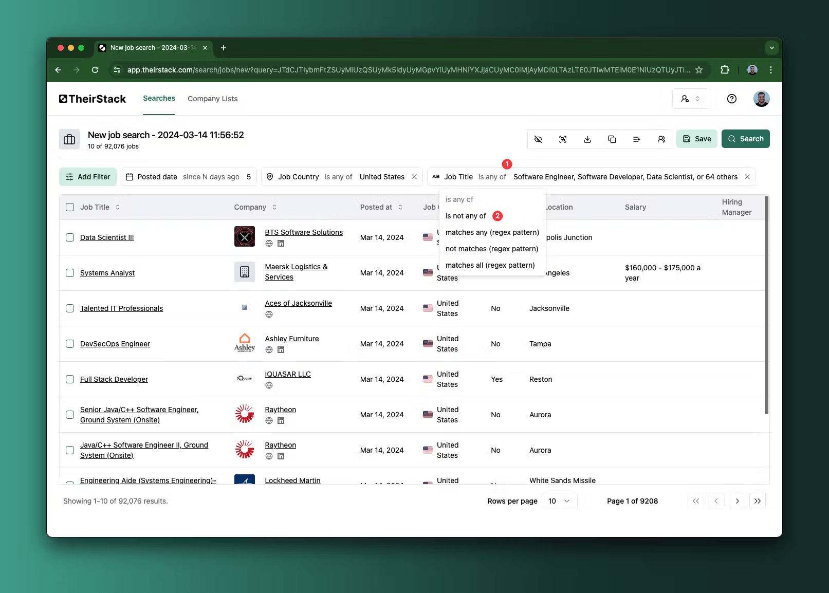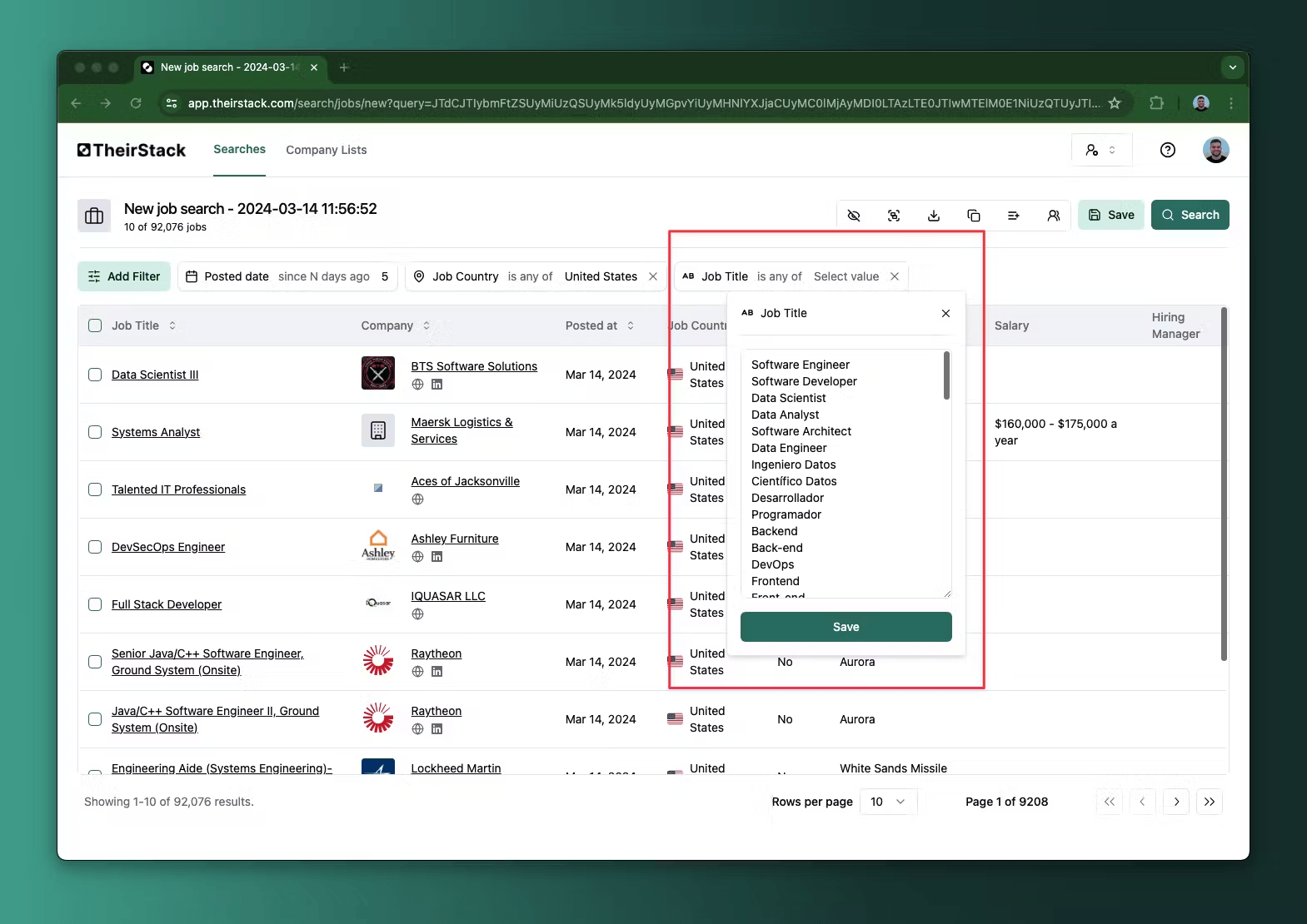 The most basic kind of filter you could make is filtering by job title. By default, the filter operator that is selected when you filter by job title is the "contains any" filter. You can pass multiple job titles and our search engine will return jobs that match any of the job titles passed.