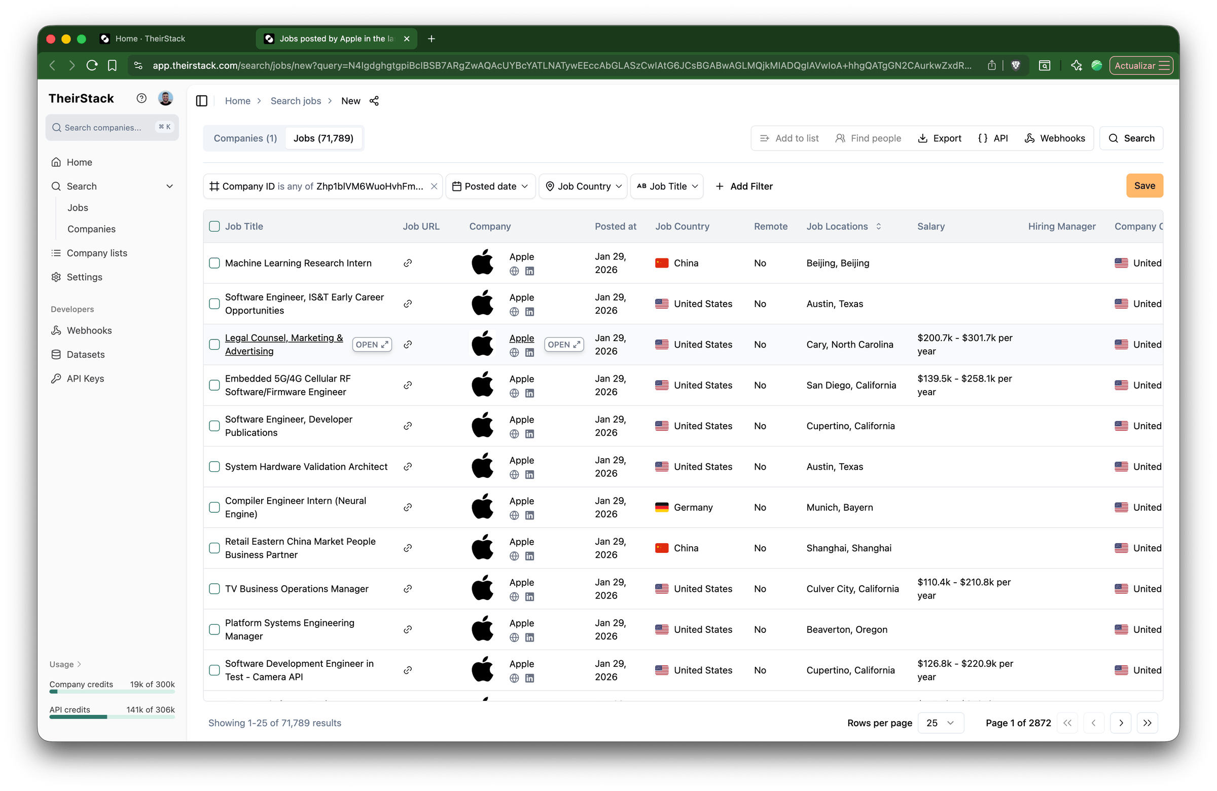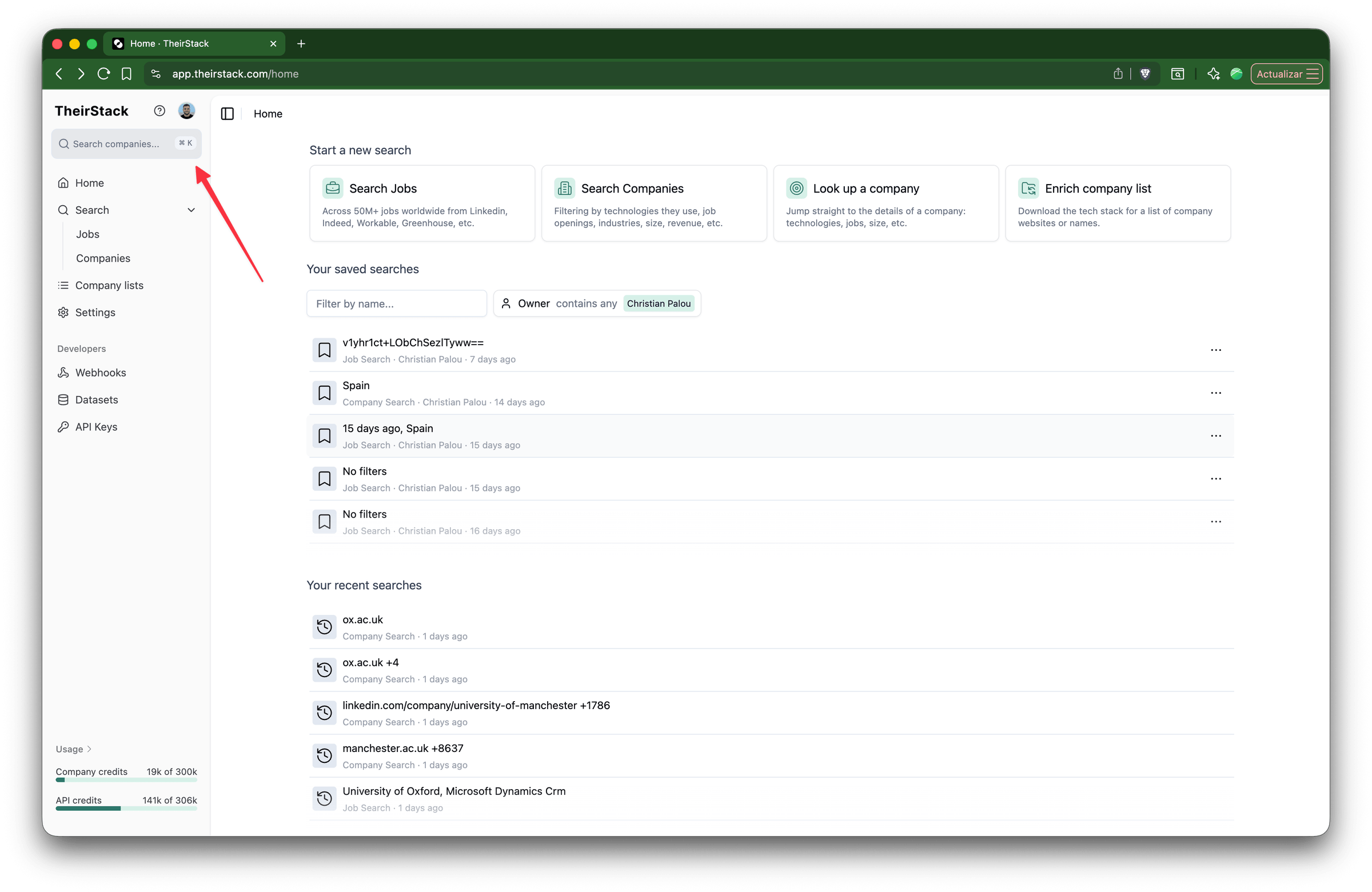 To find historical job postings from any company, use TheirStack's company lookup feature. Search for a company by name or domain, then view all jobs they've ever posted—including expired ones.
