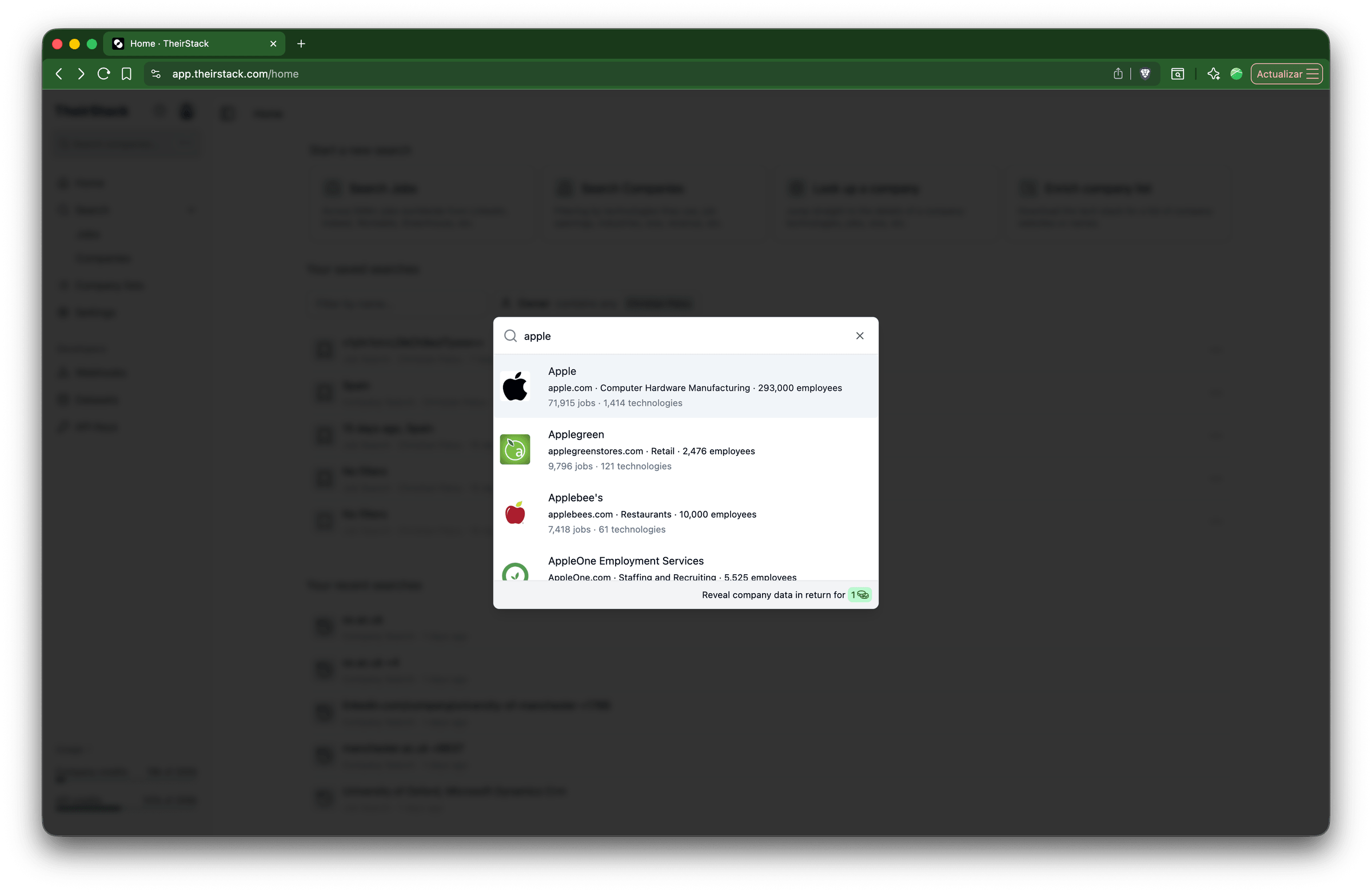 Type the company name or domain. Select the company from the dropdown results.