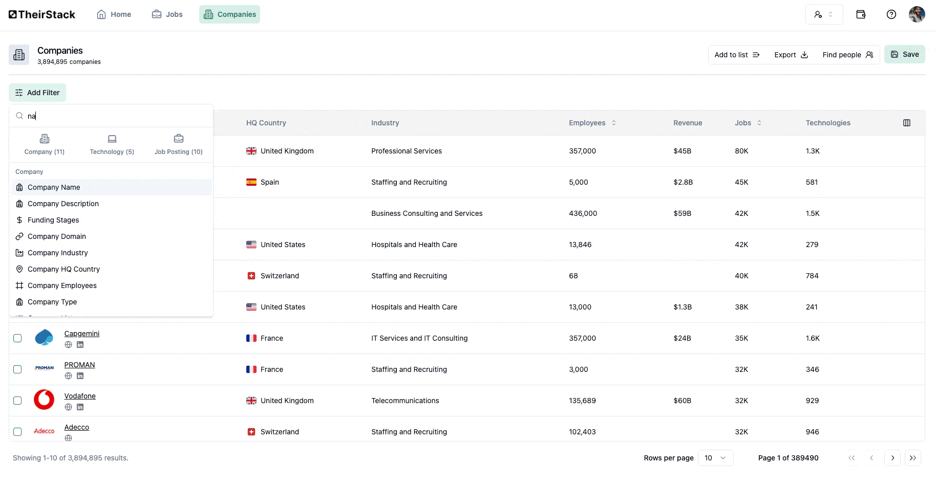 - Go to app.theirstack.com and open a new company search