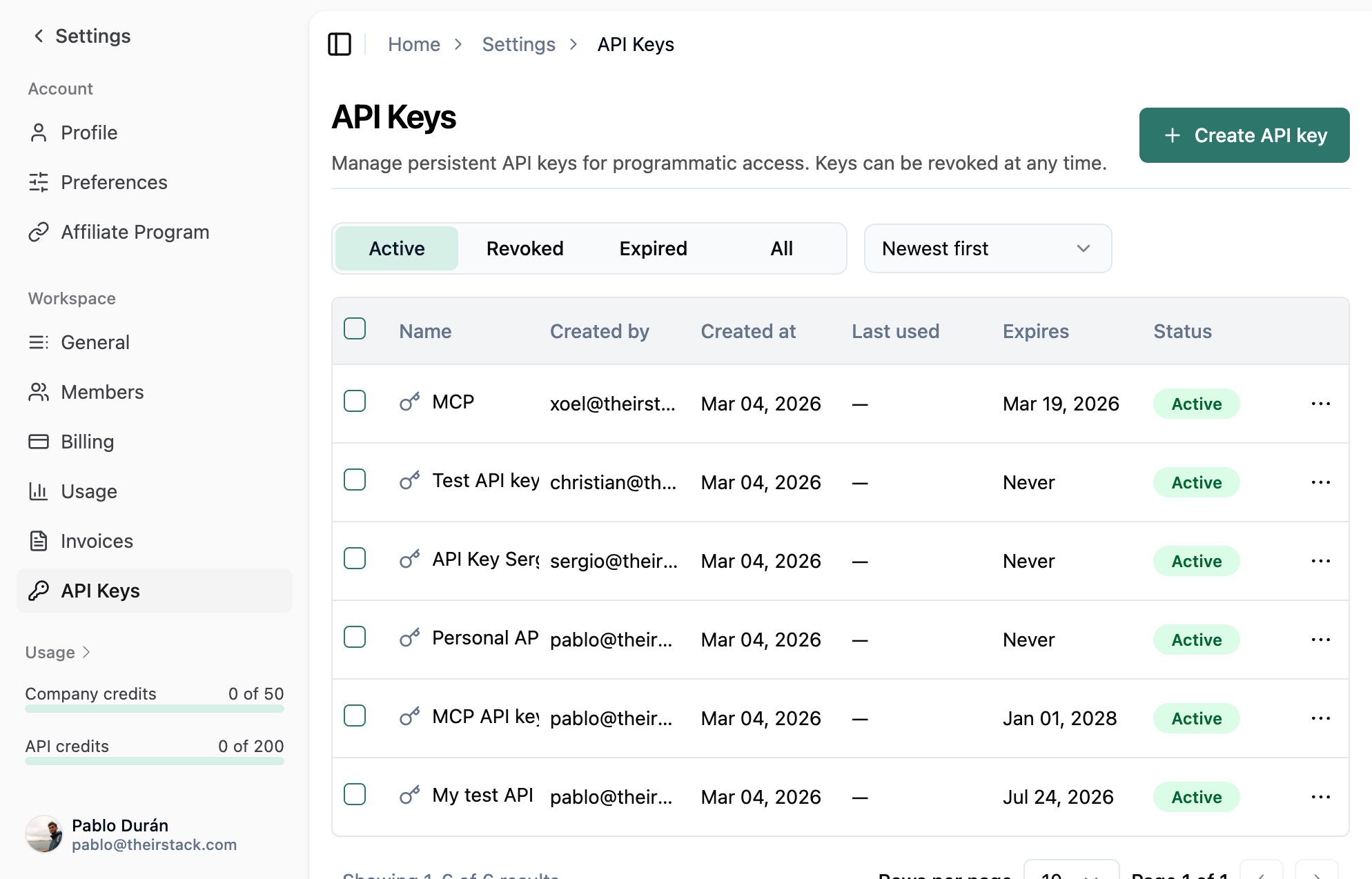 Now you get one screen per workspace with optional expiration when creating a key and revoke when you need to—usage history is preserved.