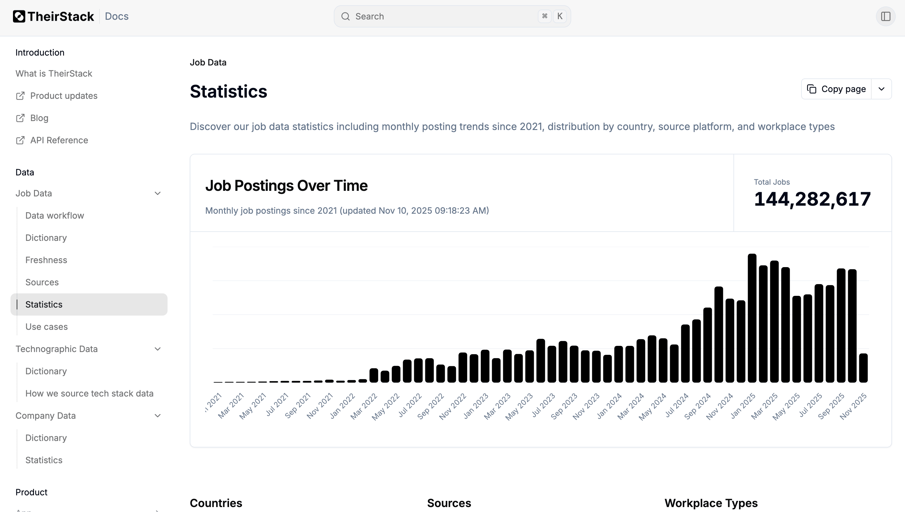 We've added a new Jobs Statistics page where you can see the total number of jobs discovered each month. You'll also find breakdowns by country, source, and workplace type.